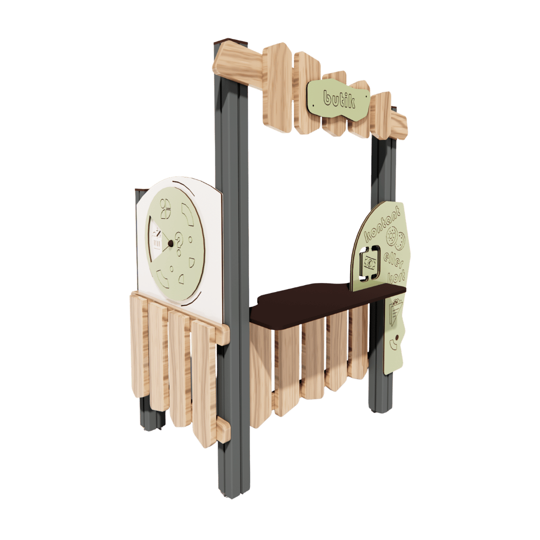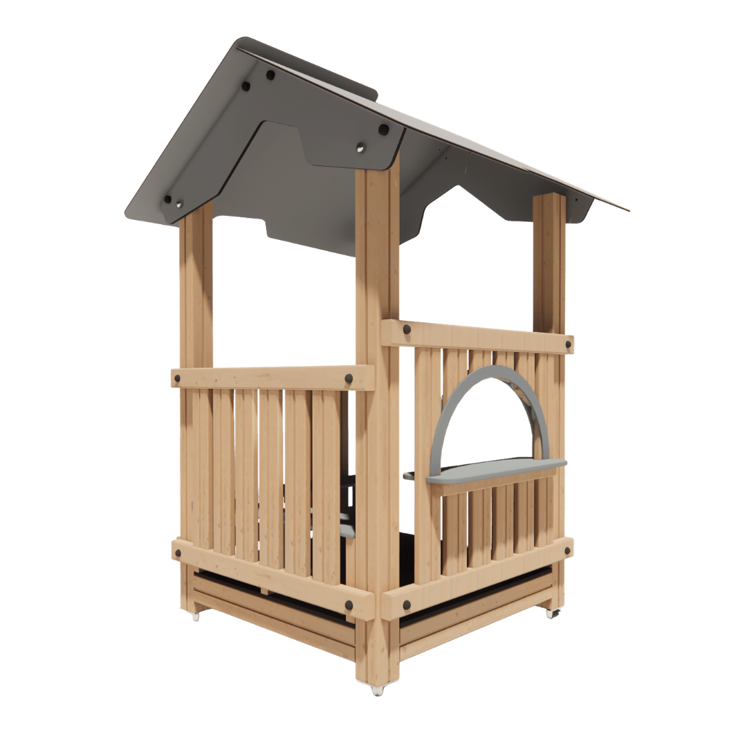 Legehus med tag samt siddepladser til flere børn. Af limtræsbjælker i fyrretræ.