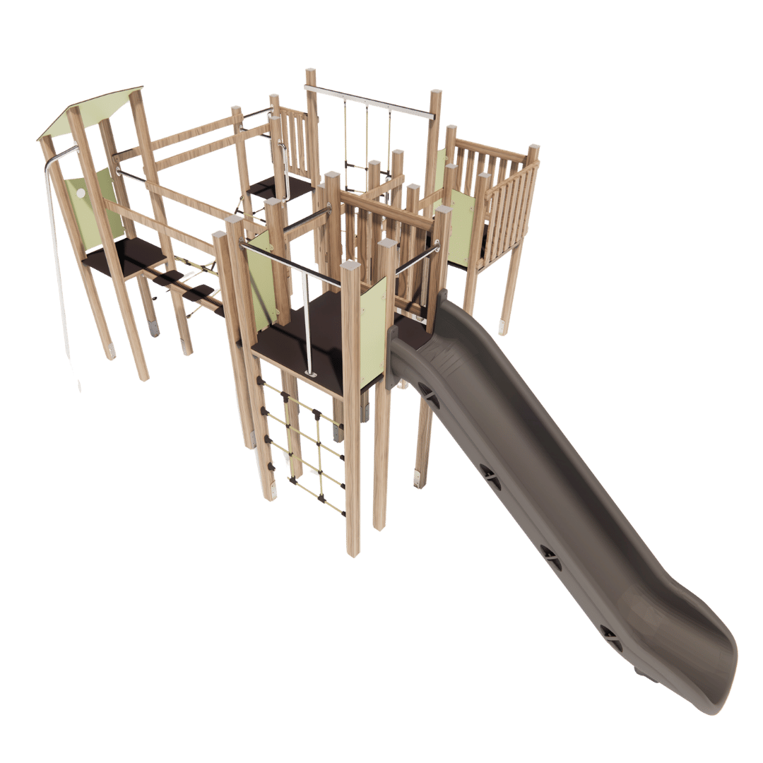 Klatreanlæg med platforme og udfordringer. Af limtræsbjælker i fyrretræ. Med stolpesko.