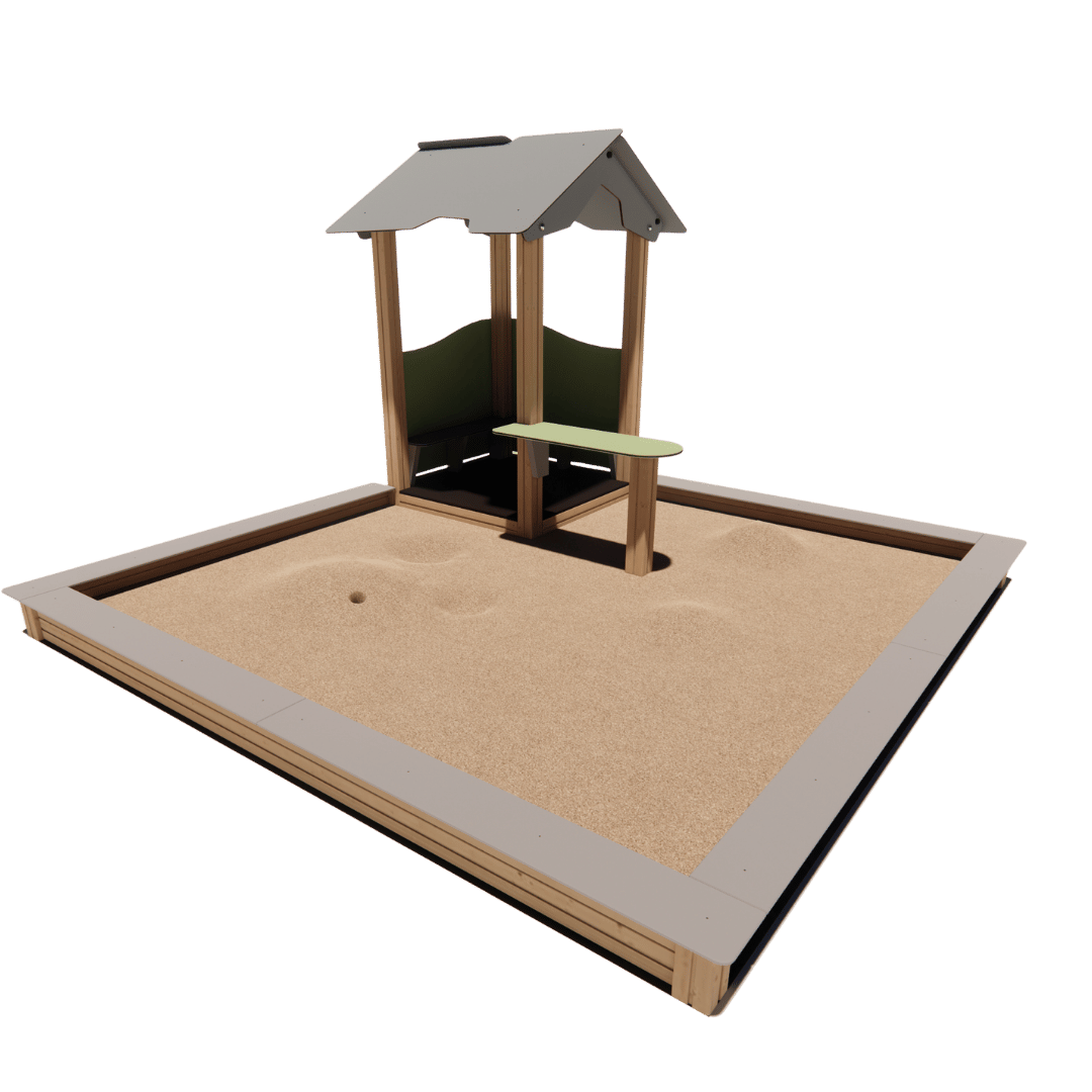 3x3m sandkasse med åbent legehus med bænk og bord. Af limtræsbjælker i fyrretræ.