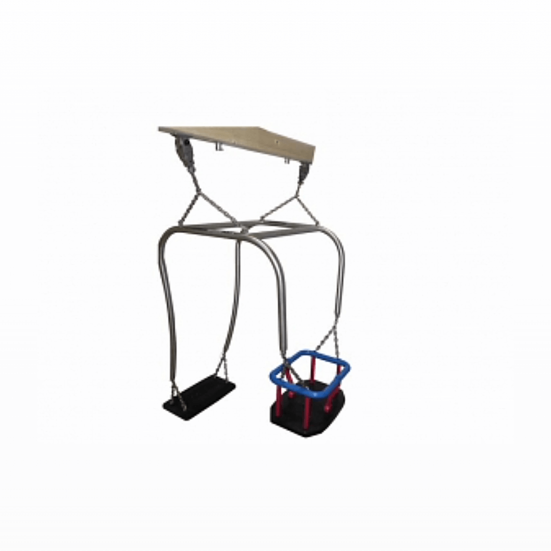 Gyngestativet er udstyret med to forskellige sæder: et fladt gummisæde (type 2A) til voksne, som sikrer komfort og stabilitet, samt et gummivuggesæde (Waabe) til barnet, der giver en sikker og behagelig gyngeoplevelse for de små.