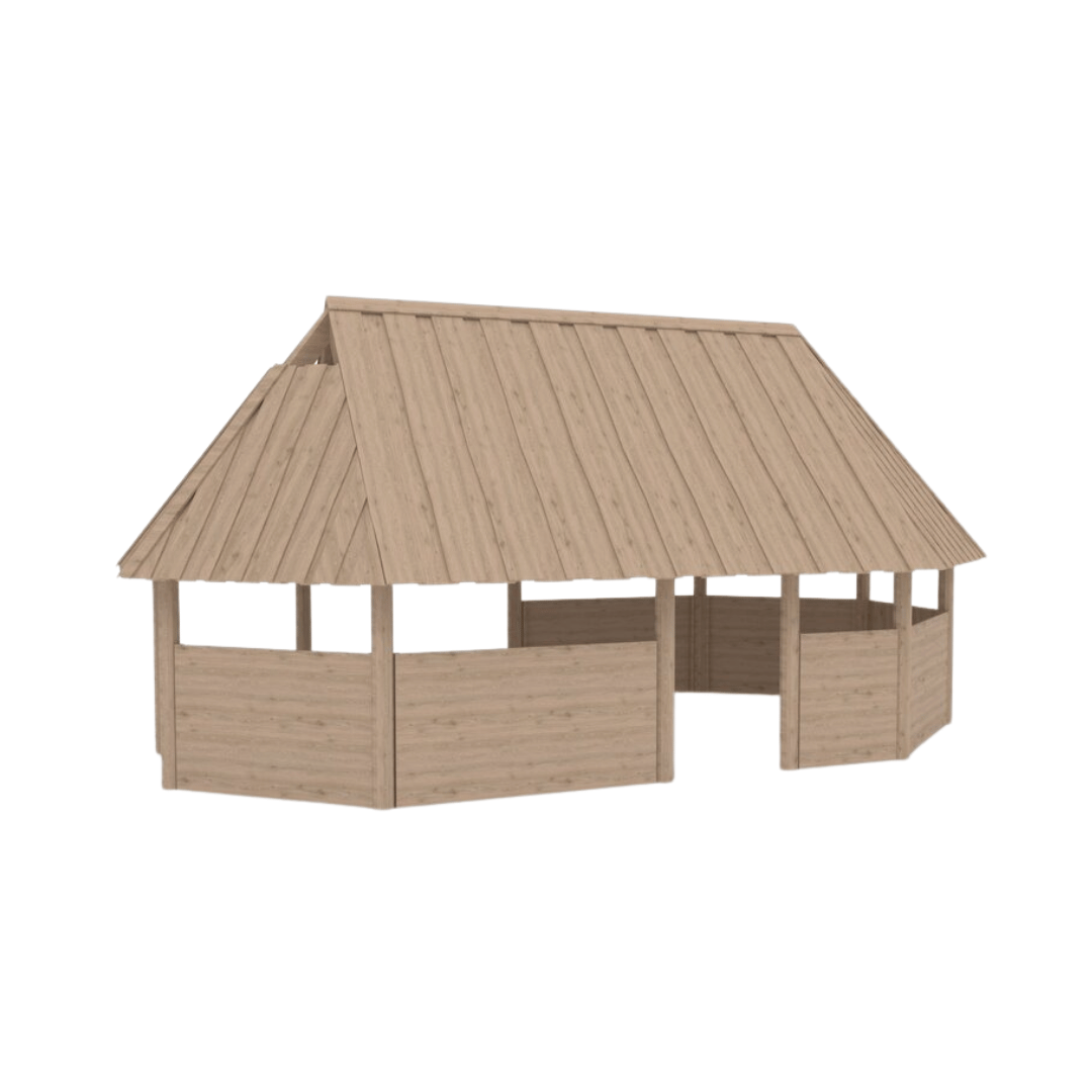 Langhuset fås også i en åben version uden sider (LE20118U) – ideelt, når der ønskes god synlighed til aktiviteterne både i og omkring huset.