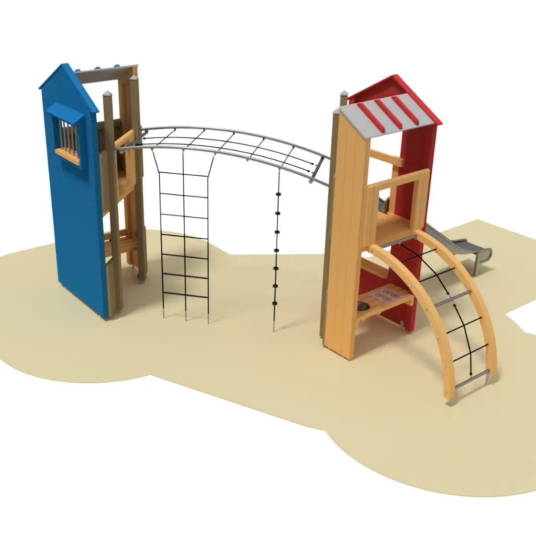 Det dobbelte legetårn tilbyder en spændende kombination af legemuligheder, der giver børnene en verden af eventyr og udforskning. Det første tårn, fængselstårnet, fascinerer med sit vindue med gitter, der giver børnene mulighed for at forestille sig sig som fanger på flugt eller som fængselsbetjente på vagt. Ved hjælp af klatrebroen kan de klatre over til den anden side, hvor de møder det andet legetårn.