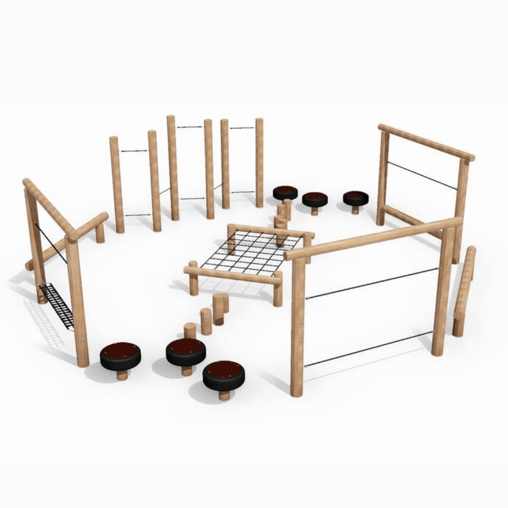 Denne kompakte balance- og motorikbane er designet til at give op til 15 børn mulighed for at lege og udfordre sig selv samtidig. Banen består af forskellige elementer, der styrker børnenes balance, koordination og motorik, herunder smalle bomme, som kræver koncentration og kropskontrol.